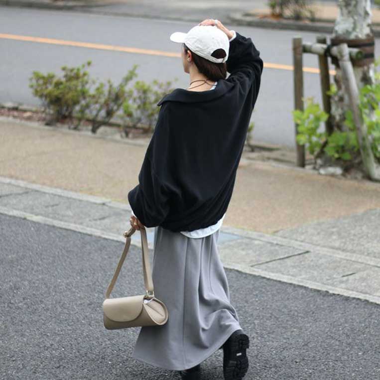 女性らしいラインを描くフレアスカートに、旬のハーフジップトップスをさらりと合わせたスタイル。