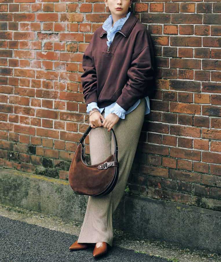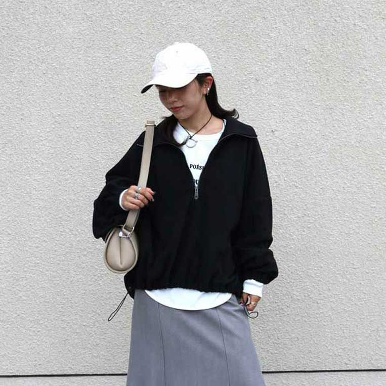 カジュアルなスウェットハーフジップトップスに、キレイめブラウスを下にレイヤードした抜け感たっぷりなコーディネート。