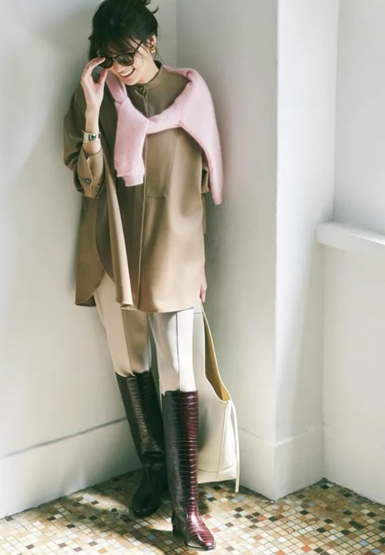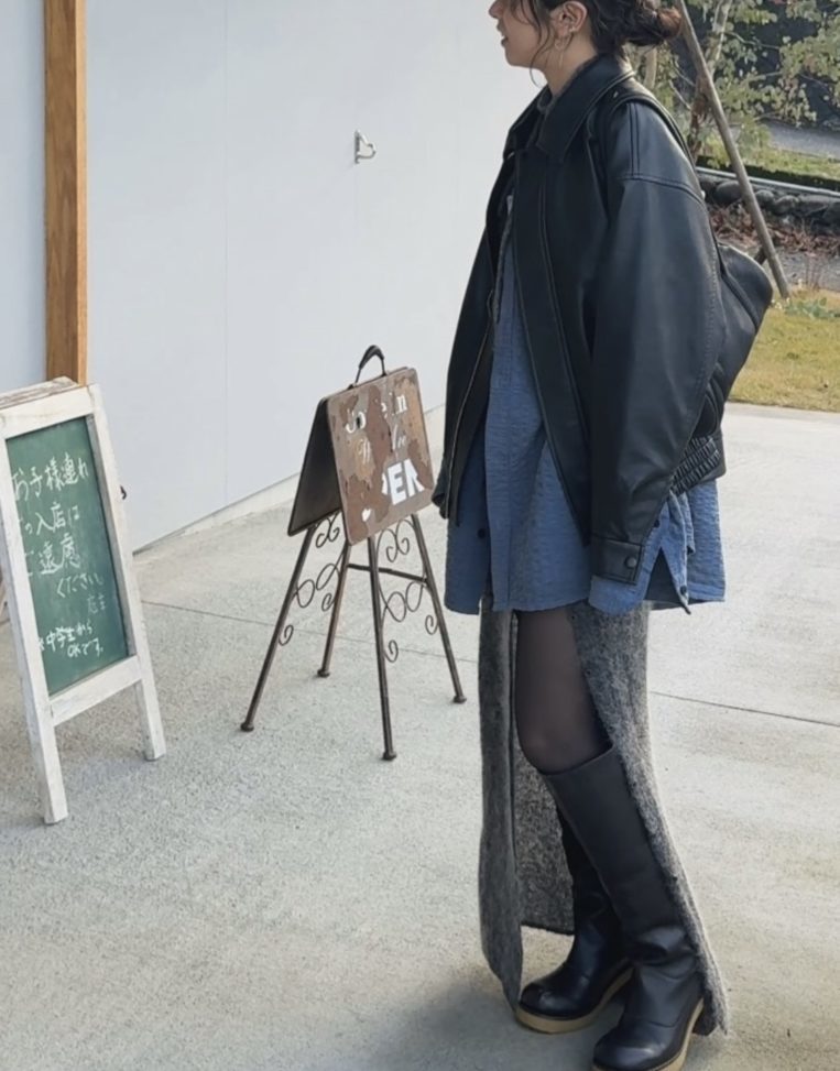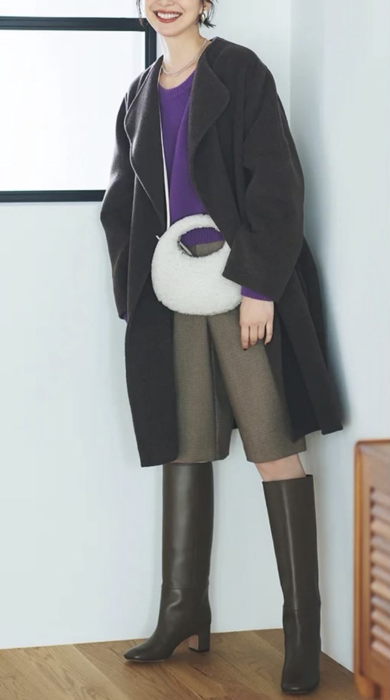 ロングブーツの存在感を活かしつつ、体のラインを拾いすぎないため、安心感のある大人のロングブーツスタイルが完成します。
