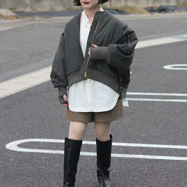 大人世代にも取り入れやすい、程よい丈感のハーフパンツにロングブーツを合わせたスタイリング。