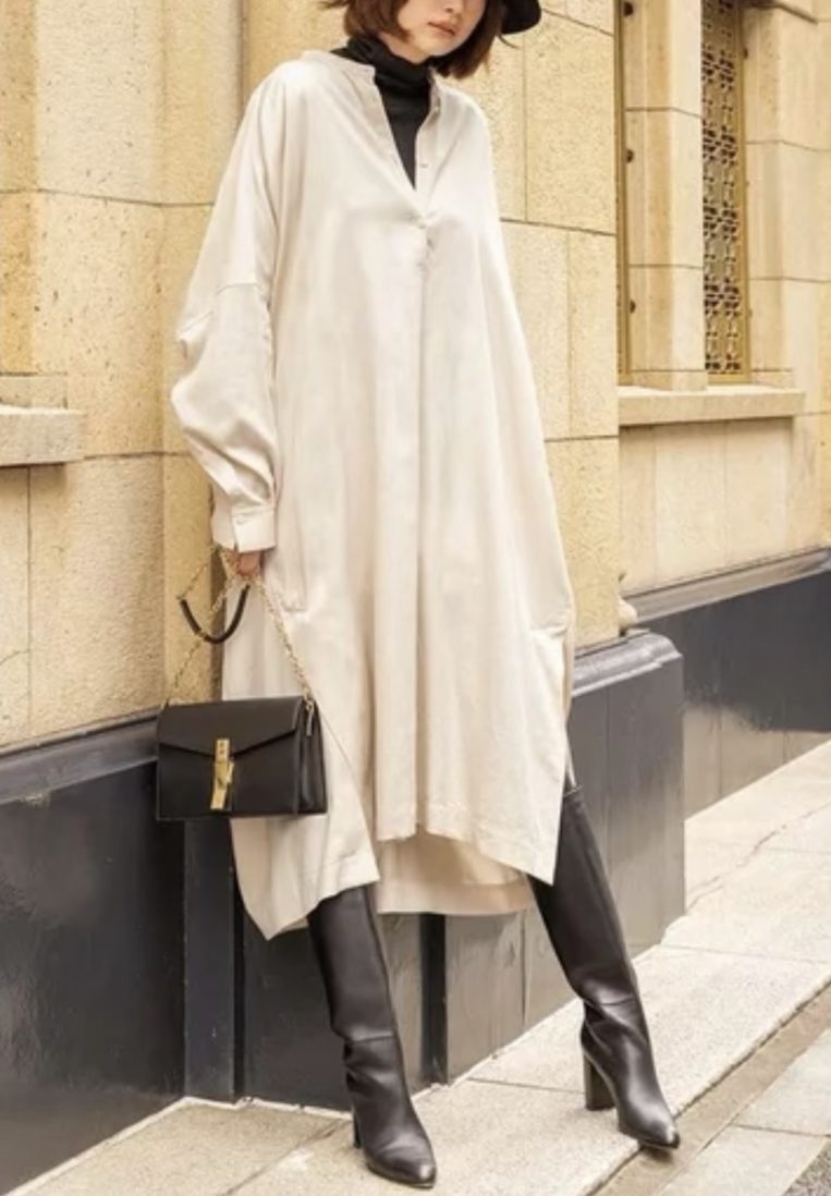 たっぷりとしたシルエットのワンピースは、ロングブーツの存在感を引き立てながら、自然なこなれ感を演出してくれます。