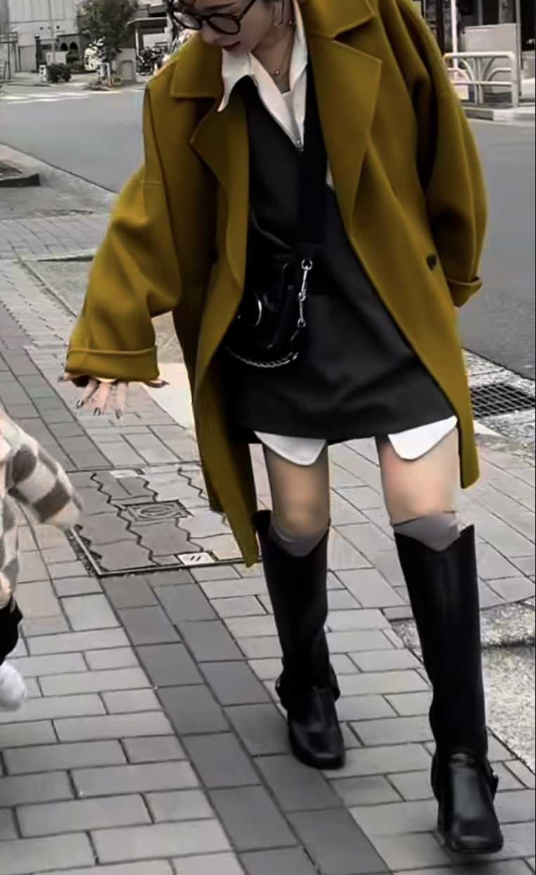 オーバーサイズのコートを羽織ることで、シルエットにメリハリが生まれ、洗練されたロングブーツスタイルに。