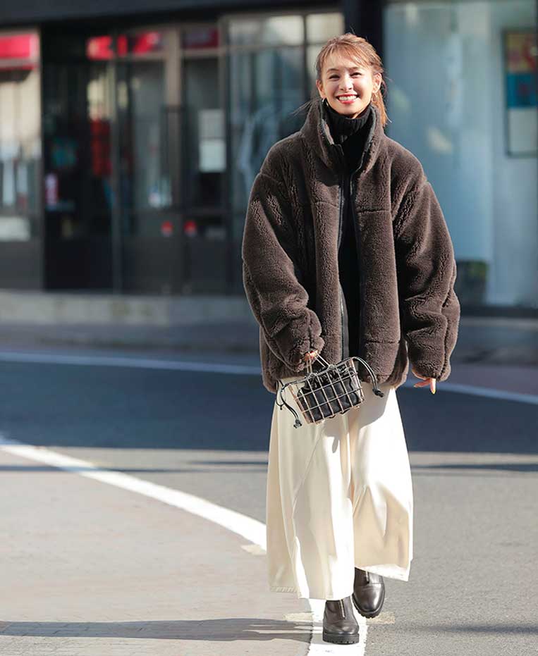 ここ数年トレンドであるボアのブルゾン(ヒップまでの丈感)を使用した旬な冬コーデ。