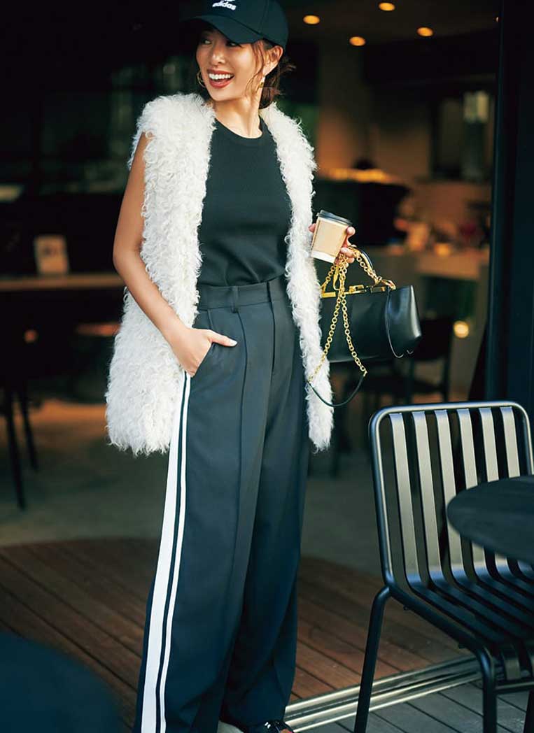 上品なファーベストには、あえてスポーティなラインパンツを合わせて“こなれカジュアル”にシフト。
