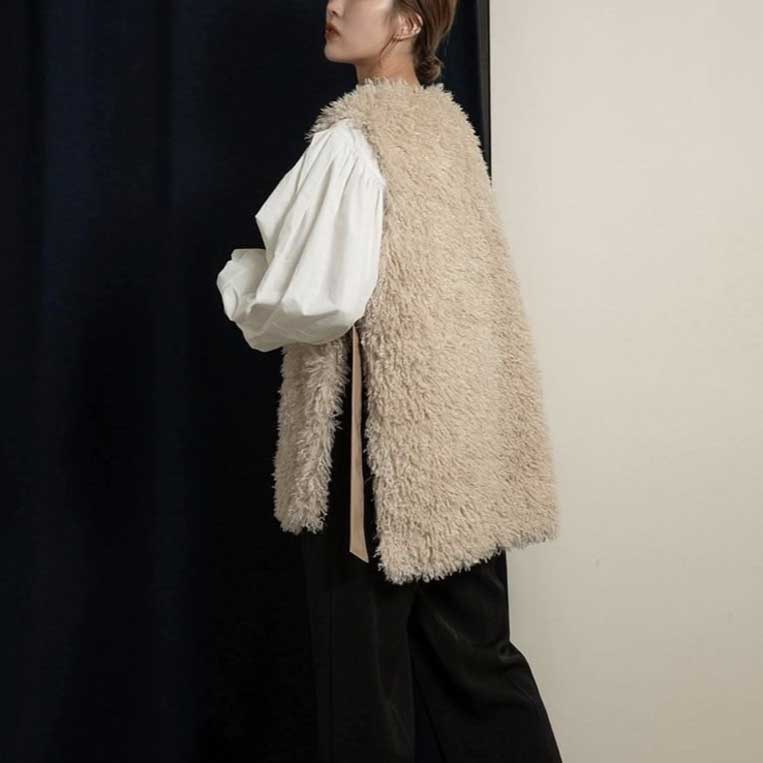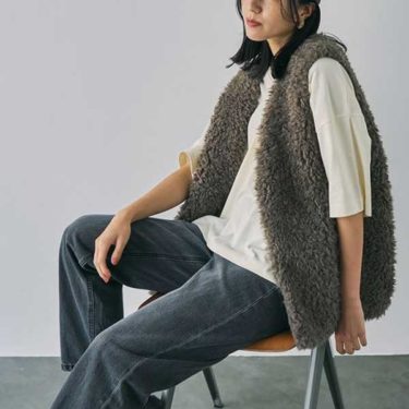 ふんわりとしたボアのような表情が魅力のカジュアルファーベストは、大人の抜け感カジュアルにぴったりの一着。