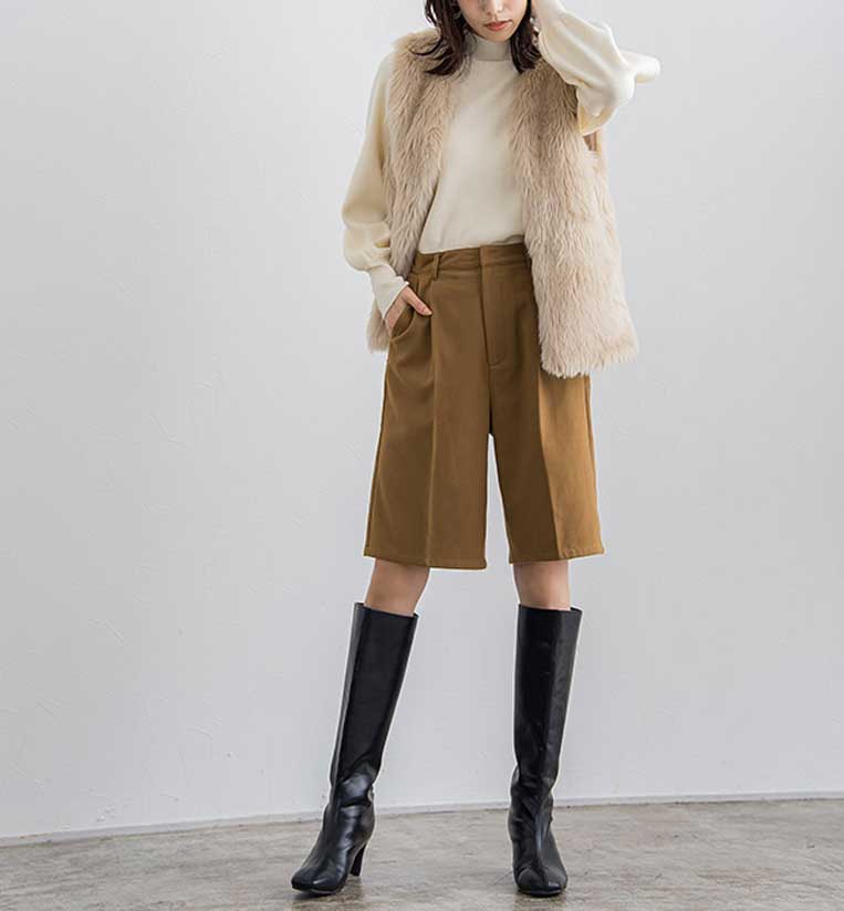 今季トレンドのハーフパンツをファーベストに合わせれば、大人の抜け感がぐっと高まるスタイリングに。