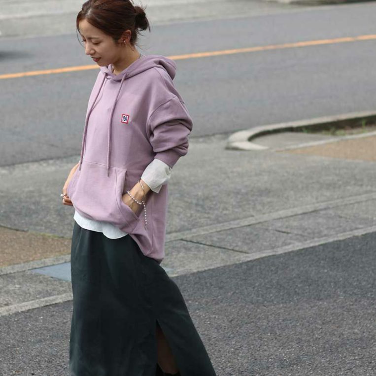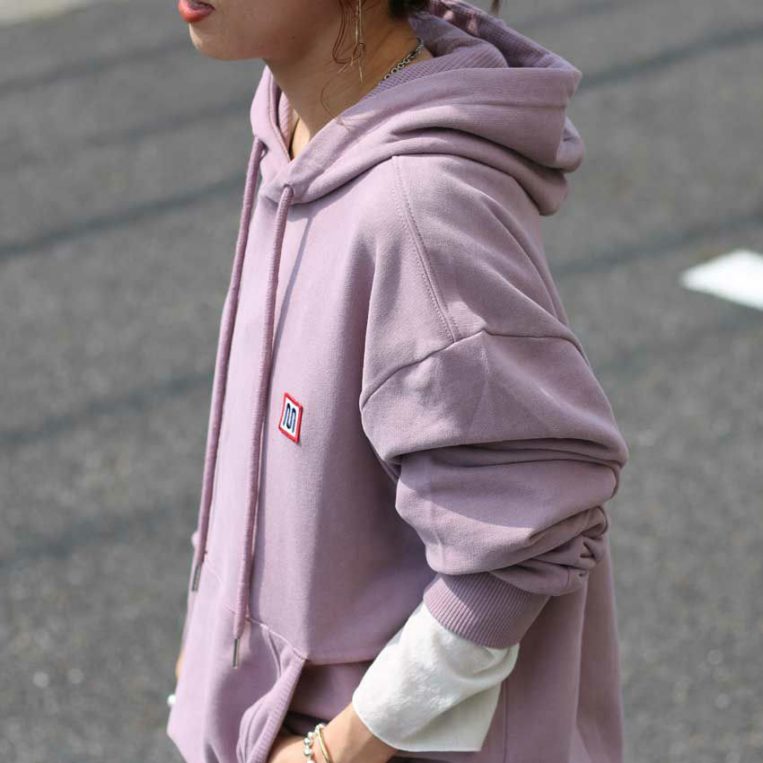 大人の女性が落ち着いた印象で着られる、ダスティピンクのプルオーバーパーカー。