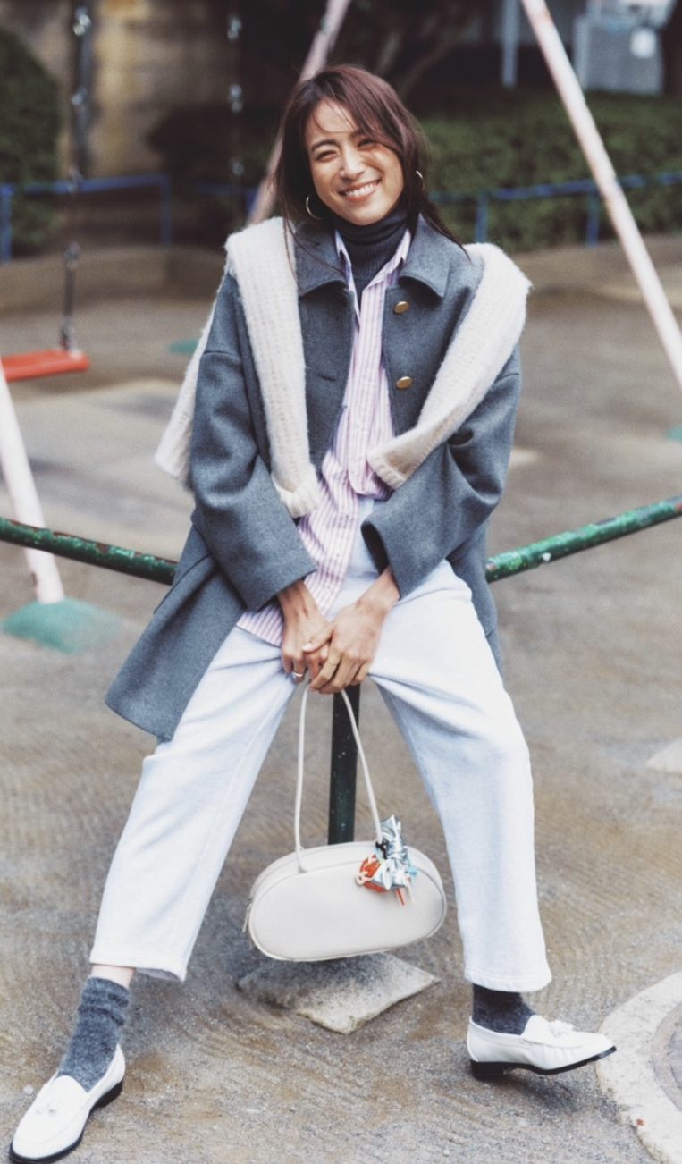 ベージュ、グレー、ネイビー、ブラウンなど、30代の定番カラーと合わせることで、一気に大人顔に。