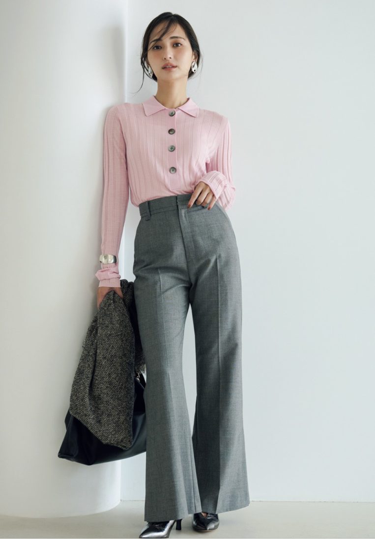 カジュアルなピンクのポロニットに、シックなグレーのボトムスを合わせて、程よくスタイリッシュに。