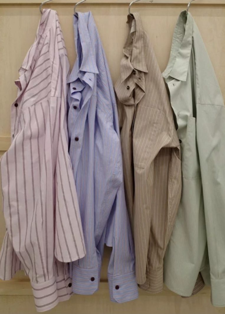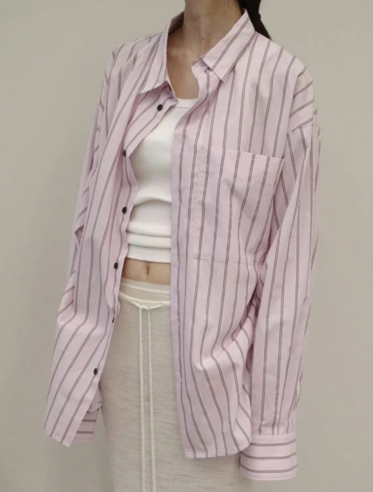 2026年はピンクのストライプシャツもトレンドに。