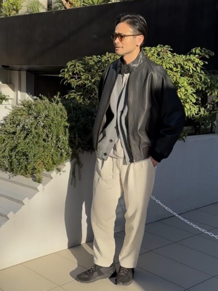 無骨でハードな印象のレザーを、タックワイドパンツでやわらかく中和。