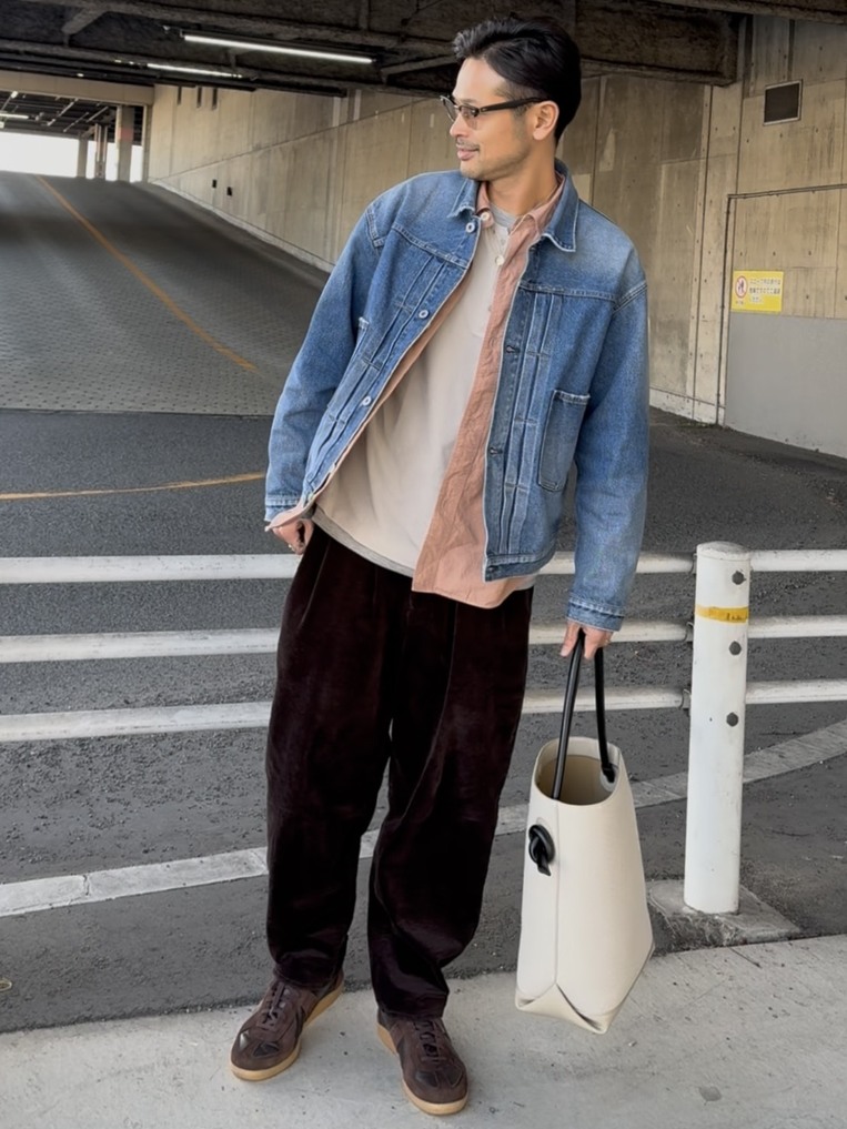 トレンドのGジャンに、キレイめタックワイドパンツを合わせた大人のきれいめカジュアル。