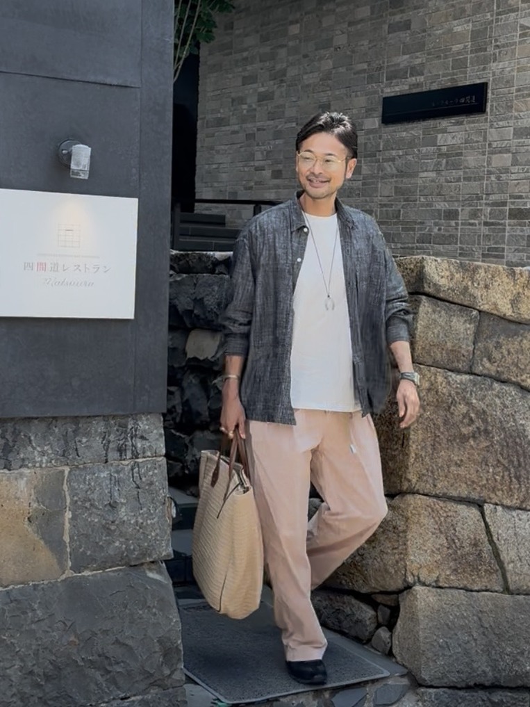 カジュアルに寄りがちな麻素材も、上質なタックパンツを合わせることで一気に大人の表情に。