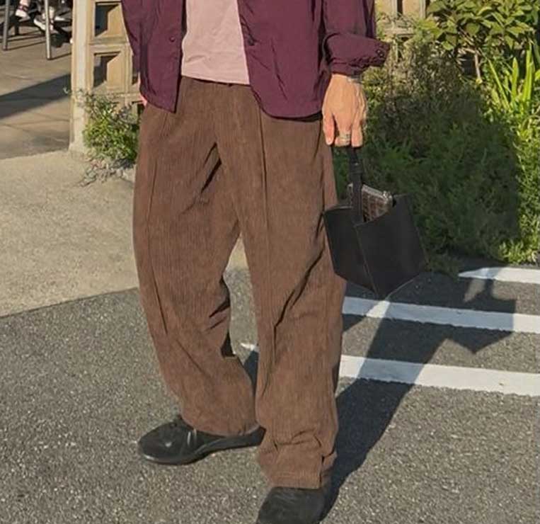 季節感たっぷりのコーデュロイタックワイドパンツ。