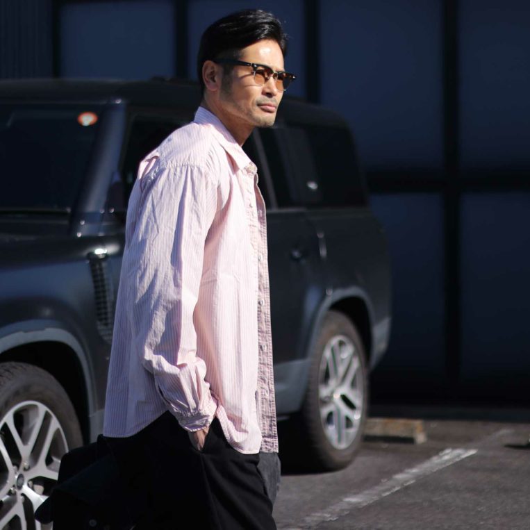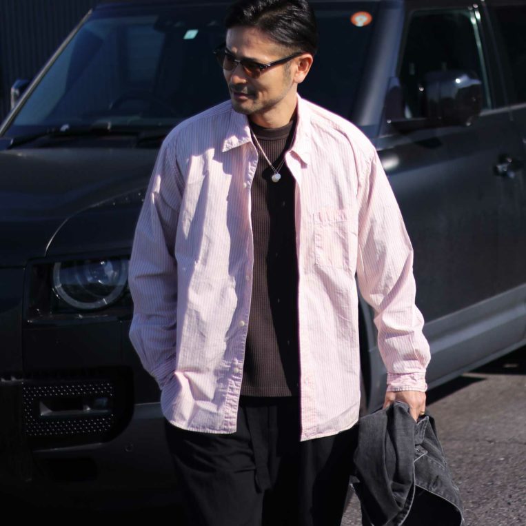爽やかなピンクのストライプ柄が目を引くシャツは、シンプルながらも確かな存在感を放つ一着。