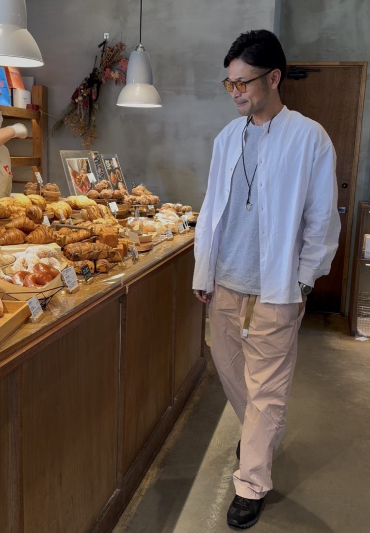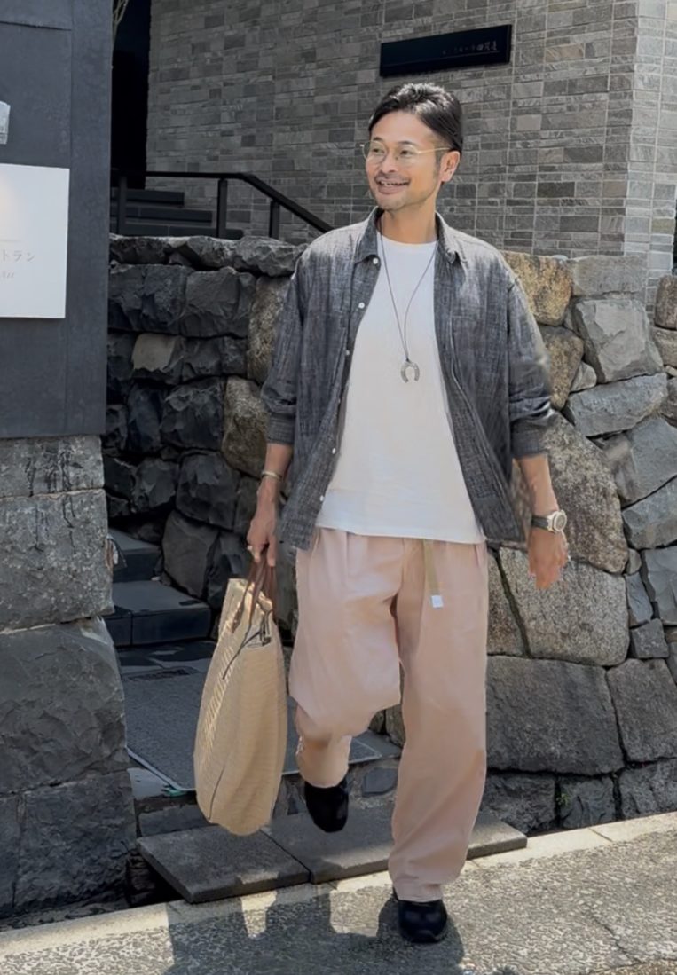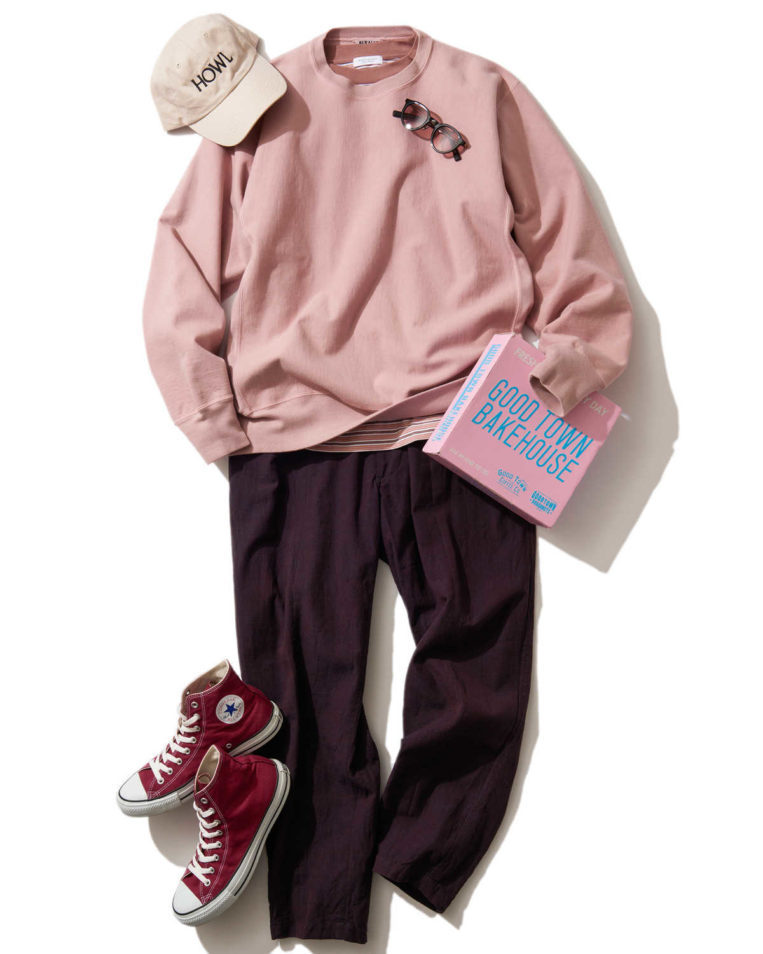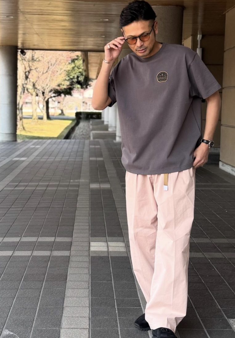 フェードピンクのボトムスに、メンズらしさを引き立てるカーキを合わせれば、大人の余裕が漂うスタイルに。