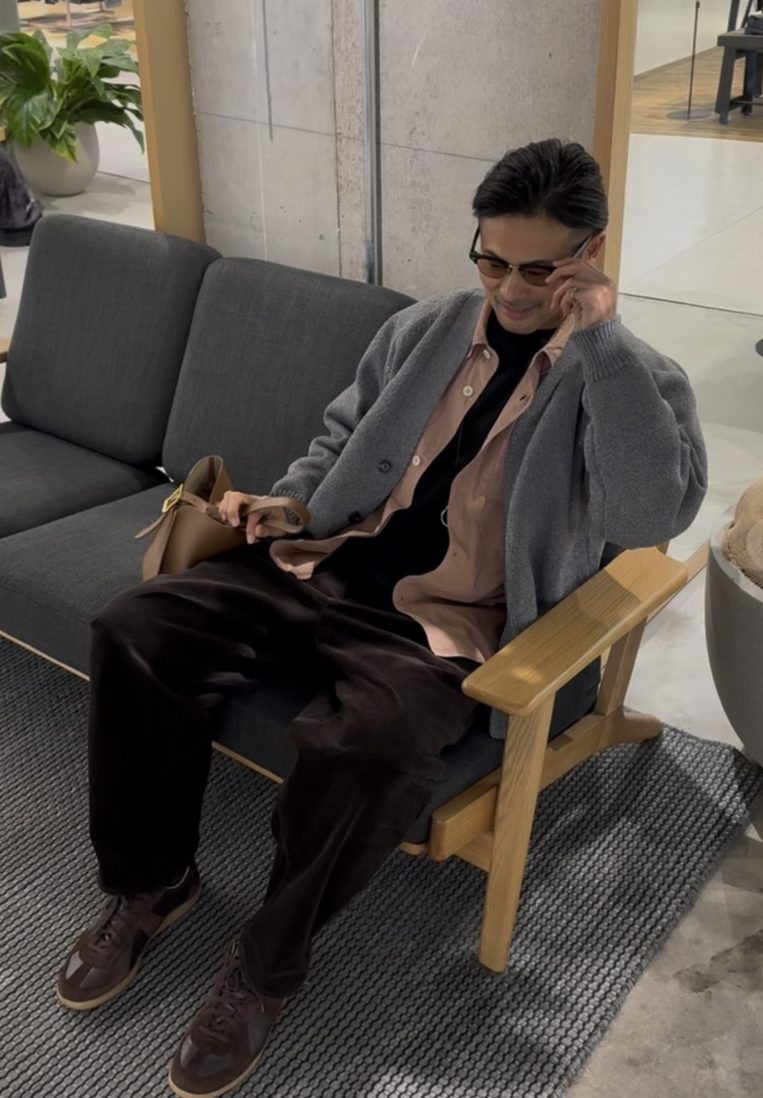 スモーキーピンクのシャツに、落ち着いたグレーのざっくりカーディガンをひとさじ。