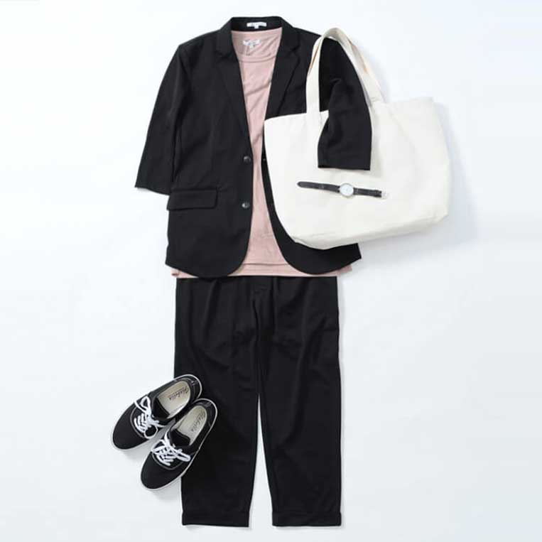 引き締めカラーのブラック合わせは、ピンクの存在感を引き立て目を惹くコーデに。