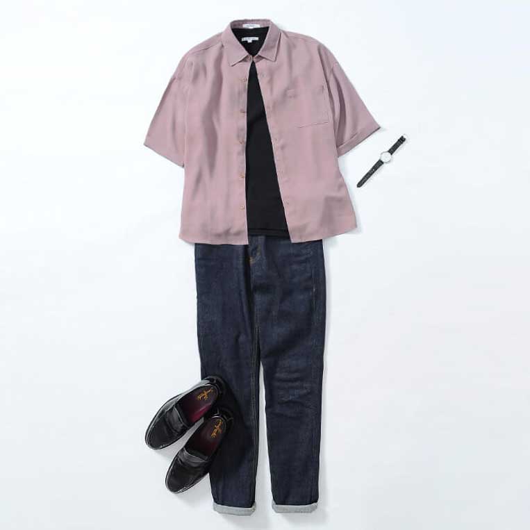 ピンクのTシャツに白シャツを重ねれば、清涼感と季節感がぐっとアップ。