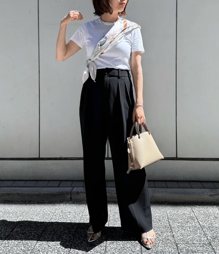 セットアップ特有の淡白さを抑え、スカーフの柄や動きが加わることで、一気にこなれ感とお洒落度がアップ。