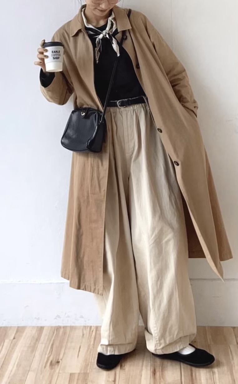 ベーシックカラーの着こなしにデザイン性のあるスカーフを加えると、視線が自然と集まり、全体のバランスに抜け感と華やかさが生まれます。