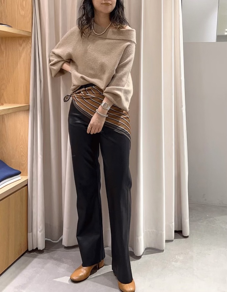 タイトスカートやワイドパンツ、ワンピースに合わせれると、今っぽい抜け感のあるスタイリングに。
