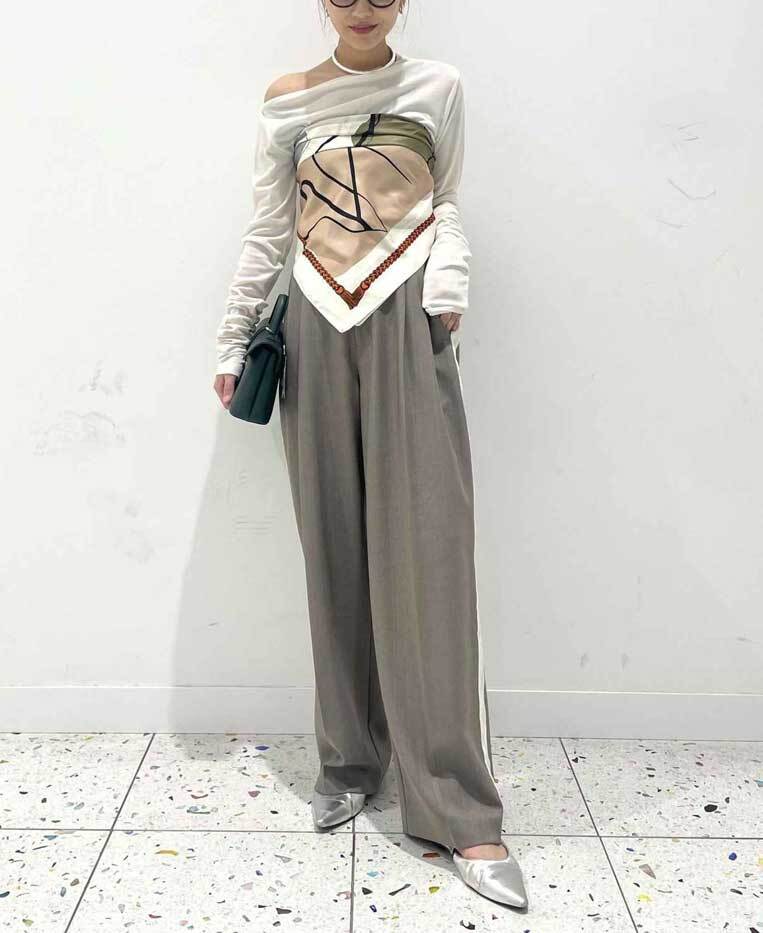 シャツのたすき掛けがここ数年で流行りましたが、今年はスカーフを使って肩掛けアレンジをするのが旬なスタイリングに魅せるカギです。