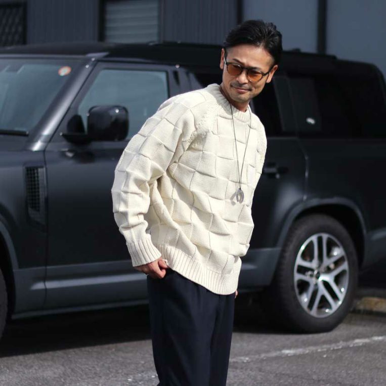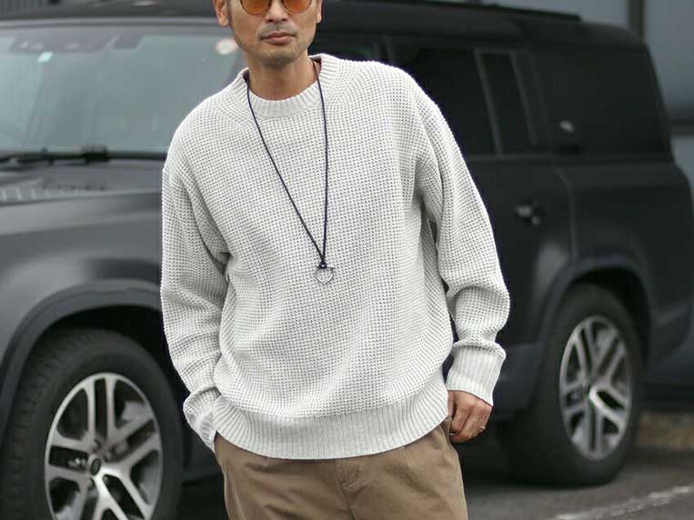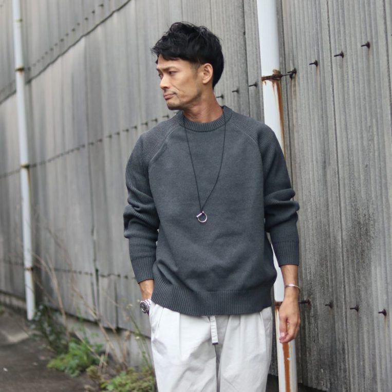 無地でも映える、袖と身頃のゲージ差による立体感が大人の表情を作るクルーニット。