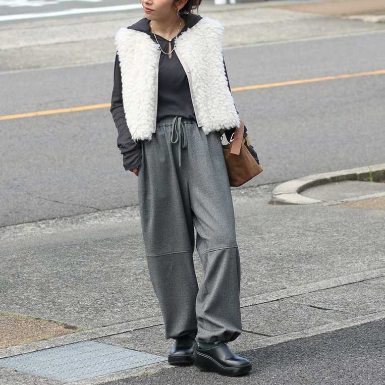お尻をカバーしたい場合は、太ももから裾までゆとりのあるワイドパンツならお尻のラインを拾わず体型を直線的に見せらます!