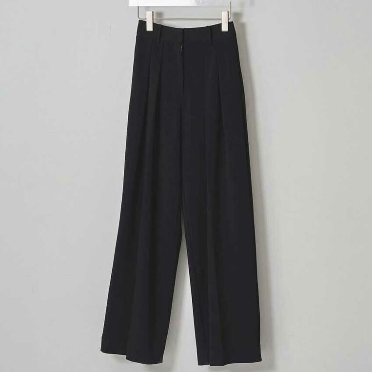 フロントタックから流れるようにつながるセンタープレスが、脚のラインをすっきりと美しく見せ、洗練されたワイドシルエットを描きます。