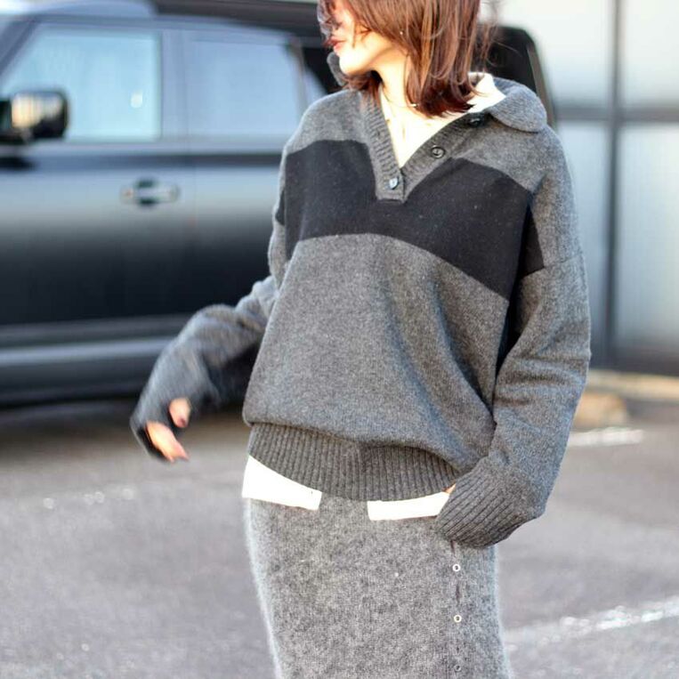 トレンドのポロ襟を、anukeらしい感性で落とし込んだオーバーニット。